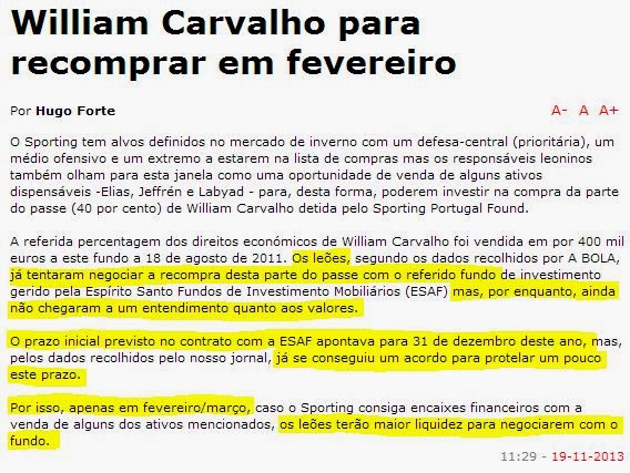 Excelente post toca na ferida. Foi o assunto que referimos aqui na semana passada relativamente às propostas de Bruno de Carvalho. O BES quer dinheiro e já percebeu que William Carvalho foi um negócio da China que vai compensar as perdas dos desvarios do Godinho.