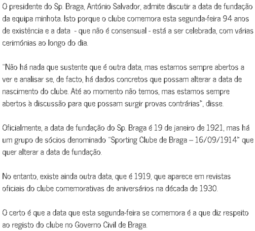 É realmente extraordinário que alguém admita a hipótese de alterar a data de fundação do clube que lidera sem que tenha conhecimento da existência de qualquer provas nesse sentido. Algo que deveria ser um motivo de orgulho para o clube é renegado porque esta malta acha que a antiguidade é um posto e que o clube fica automaticamente maior ao acrescentar-lhe mais um punhado de anos de vida completamente ocos de história.