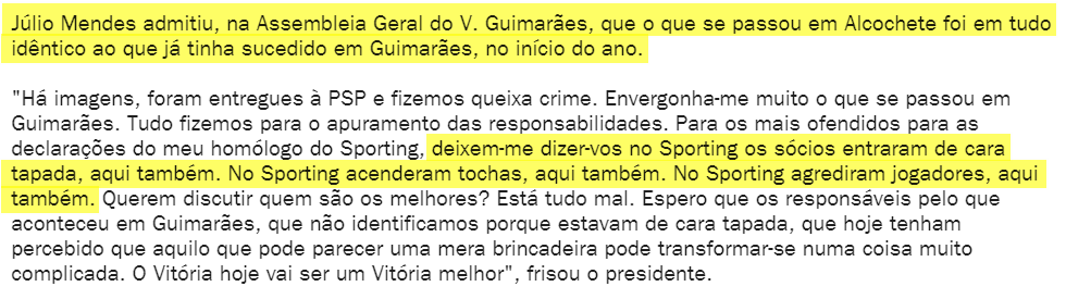 Como parece que o aconteceu em Guimarães em janeiro deste ano não terá chegado ao conhecimento de V. Exas., talvez fosse bom ficarem a par do que disse ontem o presidente do V. Guimarães na Assembleia Geral do clube.
