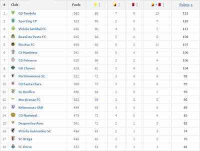 EDIT 12h30: apercebi-me agora que a tabela do Transfermarkt ainda não estava atualizada na noite de ontem - altura em que extraí o quadro que coloquei acima - com os cartões dos jogos disputados durante o dia. Aqui ficam os dados atuais, em que o Tondela passa a ser a equipa mais indisciplinada, "relegando" o Sporting para o segundo lugar desta tabela. Esta alteração não afeta a análise global e as conclusões que retirei. Os dados retirados do whoscored.com que coloquei já continham os últimos jogos.